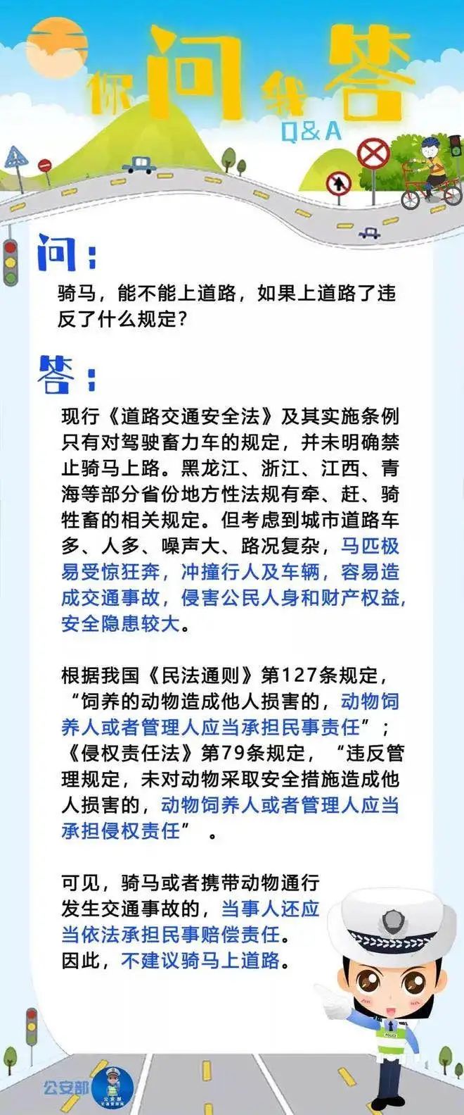 此外,交警部门提醒大家,如果因骑马导致交通堵塞或扰乱公共秩序,根据《民法通则》和《侵权责任法》也会受到处罚。