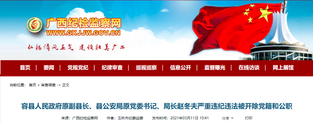 容县人民政府原副县长、县公安局原党委书记、局长赵冬夫严重违纪违法被开除党籍和公职