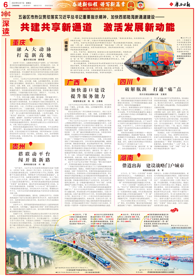 3月7日,广西日报联动重庆、贵州、四川、湖南省级党报,对西部陆海新通道建设进行联动报道。