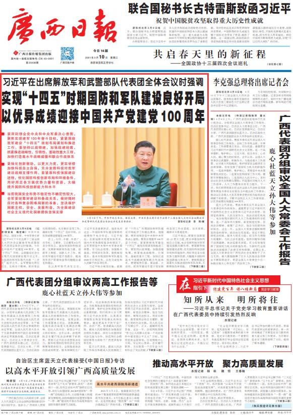 3月9日,习近平总书记出席十三届全国人大四次会议解放军和武警部队代表团全体会议。3月10日,广西日报在头版刊发重要报道《习近平在出席解放军和武警部队代表团全体会议时强调 实现“十四五”时期国防和军队建设良好开局 以优异成绩迎接中国共产党建党100周年》。