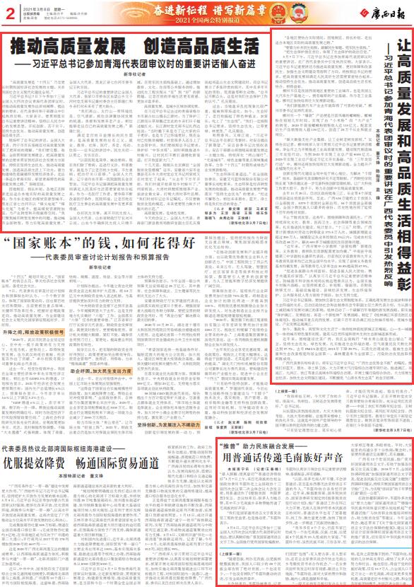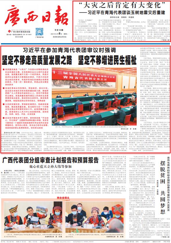 3月7日,习近平总书记参加青海代表团审议时发表重要讲话。3月8日,广西日报在头版和要闻版等重要版面和位置,刊发4篇报道: