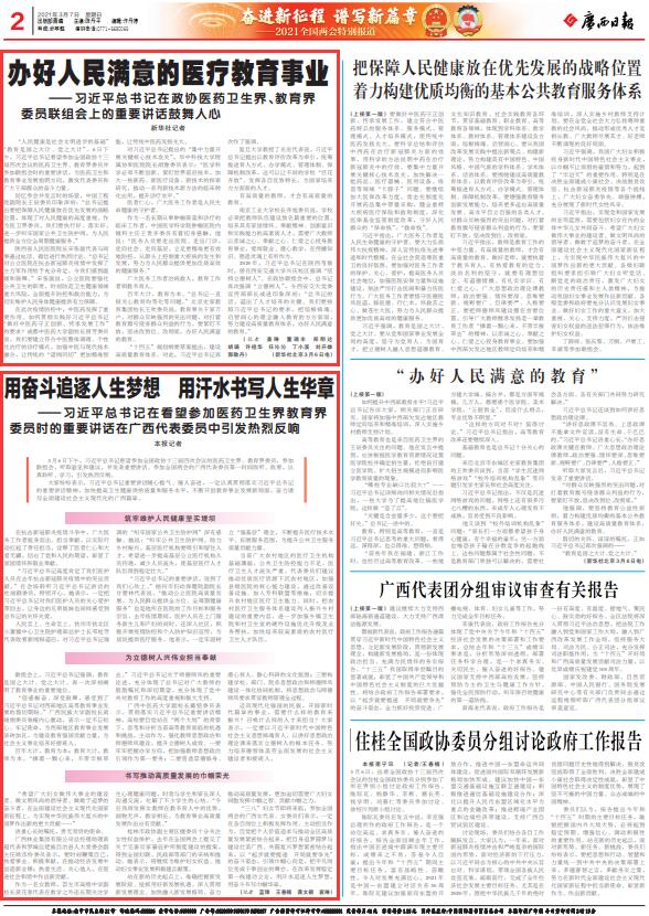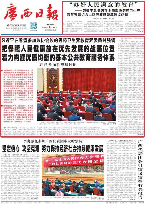 3月6日,习近平总书记看望参加政协会议的医药卫生界教育界委员。3月7日,广西日报在头版和要闻版等重要版面和位置,刊发3篇报道: