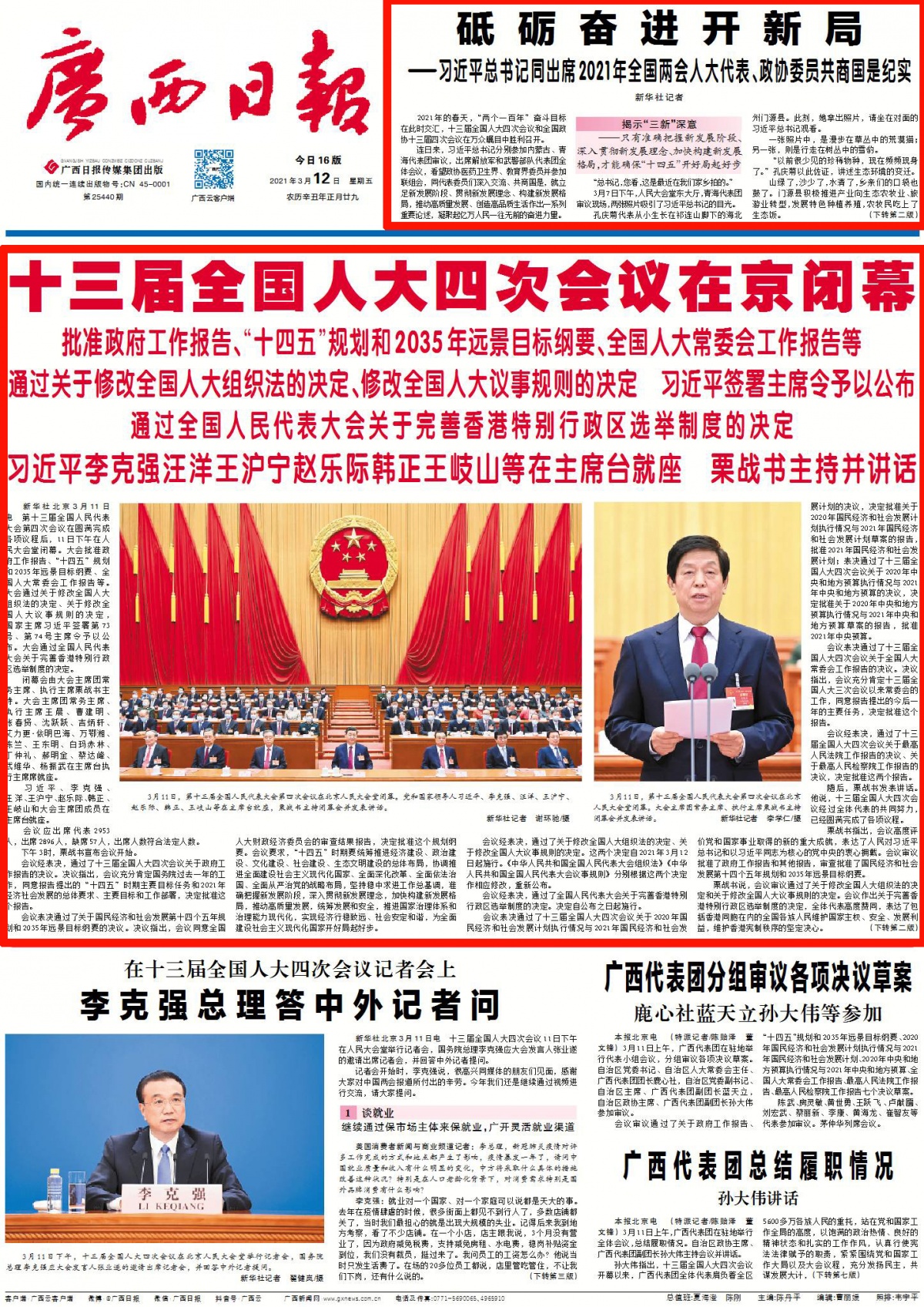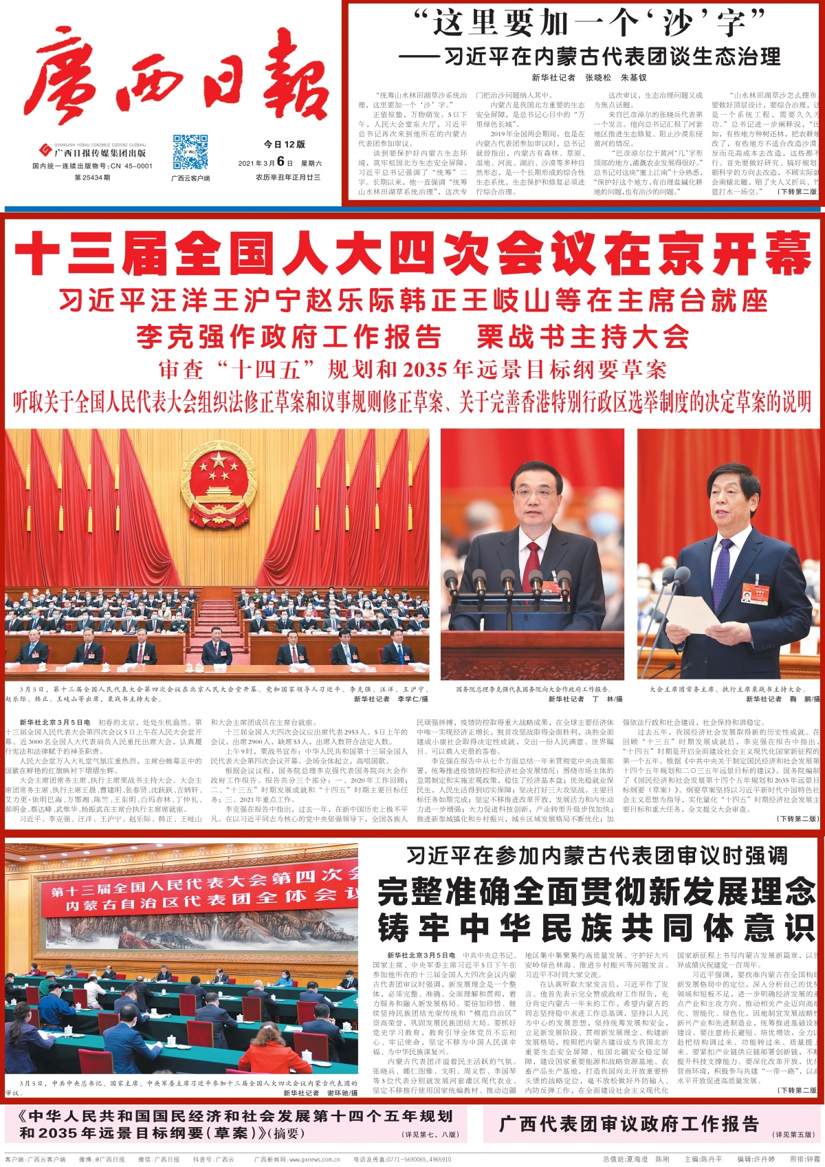 3月12日,广西日报在头版刊发重要报道《砥砺奋进开新局——习近平总书记同出席2021年全国两会人大代表、政协委员共商国是纪实》。