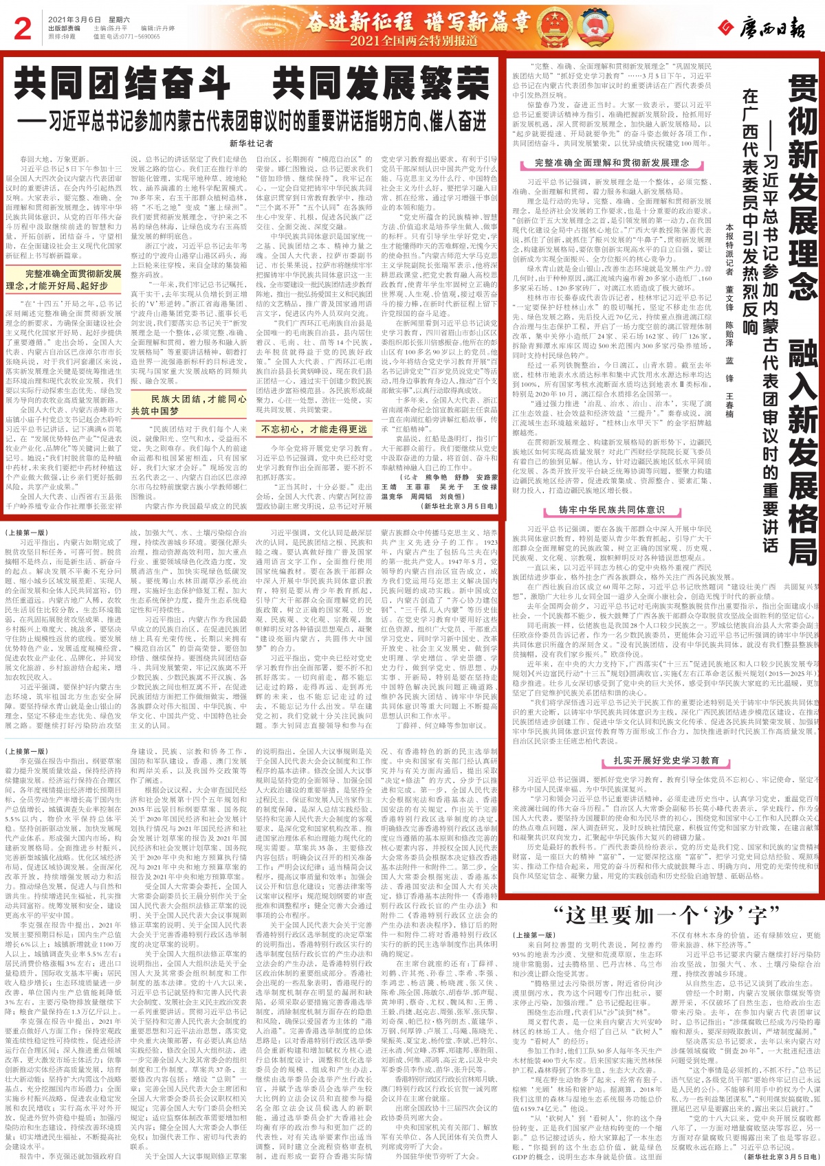 3月5日,习近平总书记参加内蒙古代表团审议时发表重要讲话。3月6日,广西日报在头版和要闻版等重要版面和位置,刊发4篇稿件: