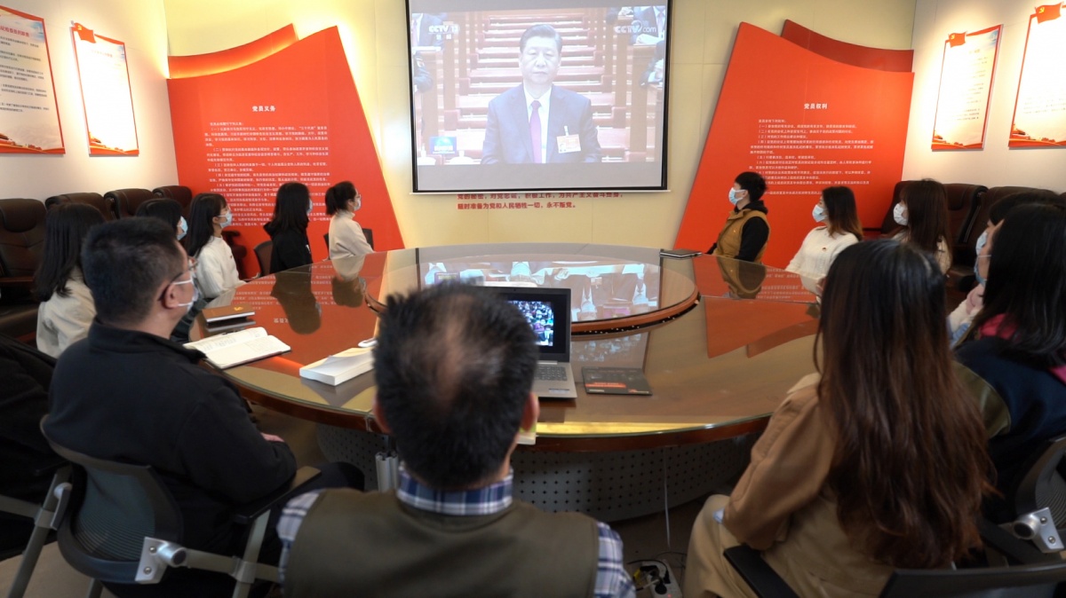 在广西新闻网党支部活动上,党员们通过投影屏幕观看广西云两会视频产品,学习习近平总书记两会讲话精神。