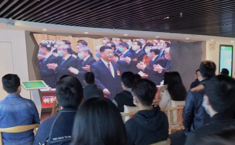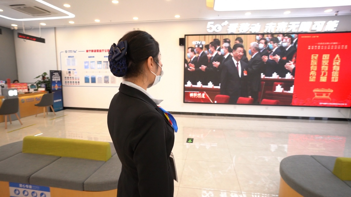 中国移动营业厅工作人员正在通过大屏观看广西云两会视频产品。
