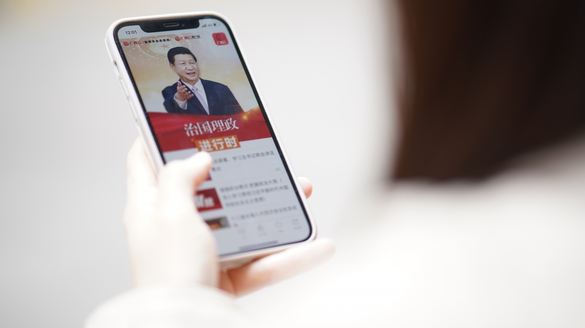 读者通过手机查看广西云客户端《习近平治国理政进行时》专题。
