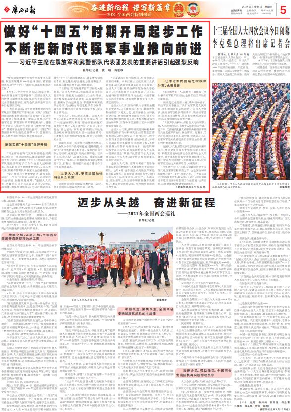 3月11日,广西日报在要闻版刊发重要报道《做好“十四五”时期开局起步工作 不断把新时代强军事业推向前进——习近平主席在解放军和武警部队代表团发表的重要讲话引起强烈反响》。