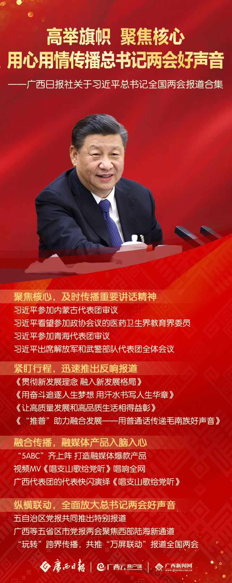 2021年全国两会召开以来,按照自治区党委宣传部的部署要求,广西日报社高举旗帜,聚焦核心,用心用情、出新出彩做好宣传报道,迅速传播总书记在两会上的好声音,助推总书记重要讲话精神在广西落地生根、开花结果。