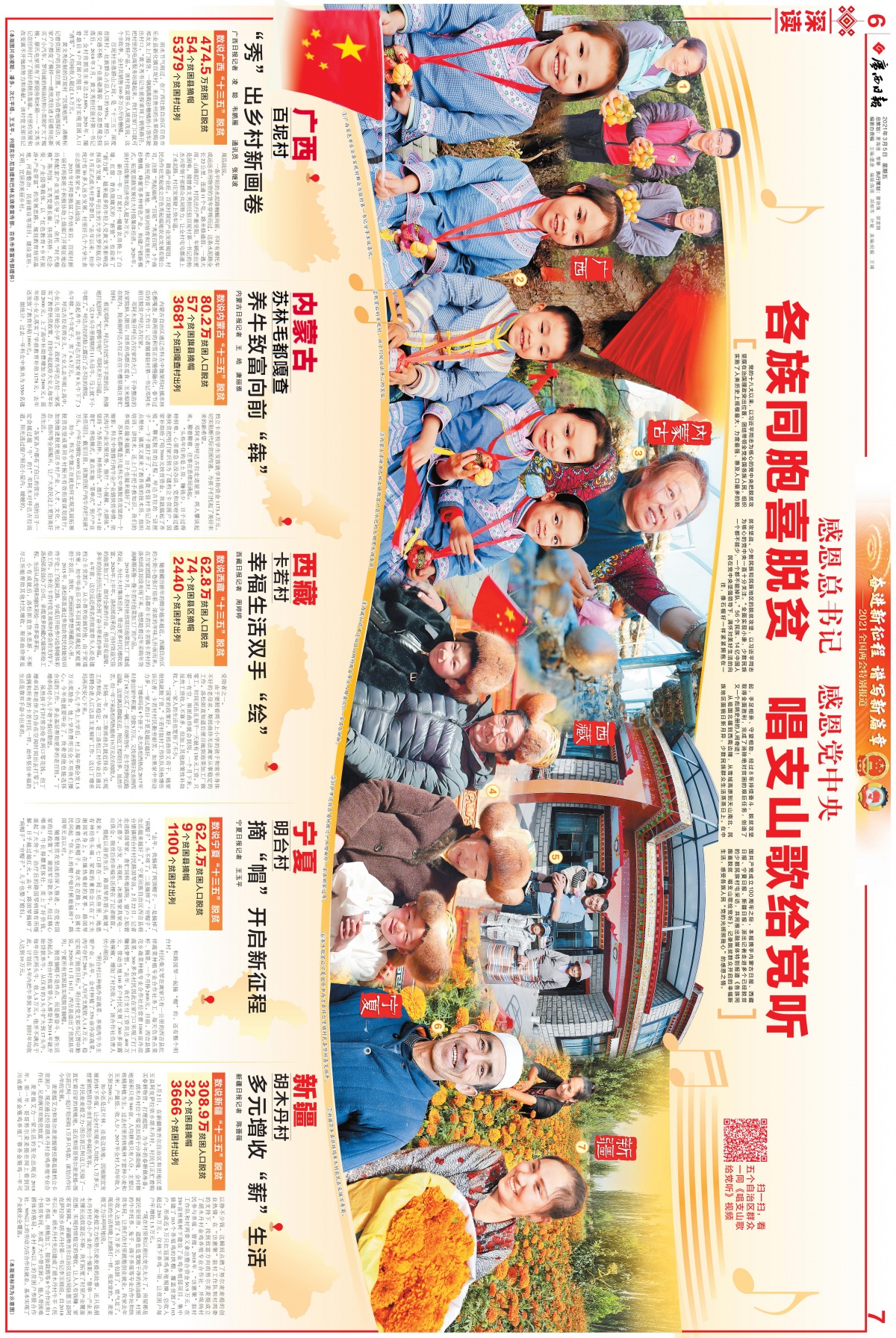 3月5日,五自治区党报共同推出特别报道《感恩总书记 感恩党中央——各族同胞喜脱贫 唱支山歌给党听》。从祖国北疆到西南边陲,从雪域高原到天山南北。五个少数民族自治区党报开展大联动,发挥自治区级党报主流媒体传播优势,共同展开报道,涉及面广、气势磅礴,全景式展现民族地区面貌日新月异、少数民族群众生活蒸蒸日上的喜人景象。广西日报刊发的《感恩总书记 感恩党中央——各族同胞喜脱贫 唱支山歌给党听》跨联版,在图片编排时植入五线谱元素,配合“唱支山歌给党听”的主题,整体风格恢弘大气、凸显桂风壮韵。