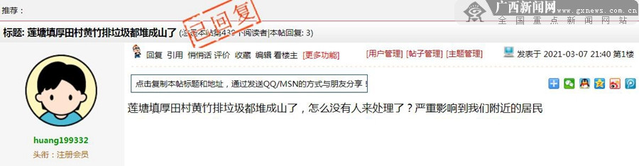 3月8日,贺州市八步区莲塘镇人民政府对《莲塘镇厚田村黄竹排垃圾都堆成山了》帖文进行回复: