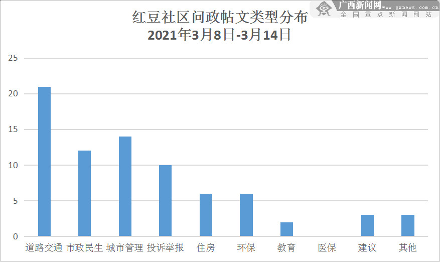 3月8-14日,红豆社区共收到全区各地网友反映各类舆情帖文77篇。其间,15篇帖文得到各地相关政府职能部门的及时回复,分别为:贺州市八步区莲塘镇人民政府、来宾市兴宾区寺山镇人民政府、贺州钟山县公安局交通警察大队、贺州市公安局平桂分局、贺州市钟山县人民法院、贺州市平桂区西湾街道办事处、来宾市兴宾区寺山镇初级中学、贺州市钟山县国土资源局、钦州市灵山县医疗保障局、来宾市城市管理局、来宾市住房和城乡建设委员会、防城港市市场监管局。