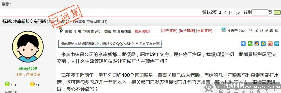 3月12日,来宾市住房和城乡建设局对《水岸新都交房问题》帖文进行回复: