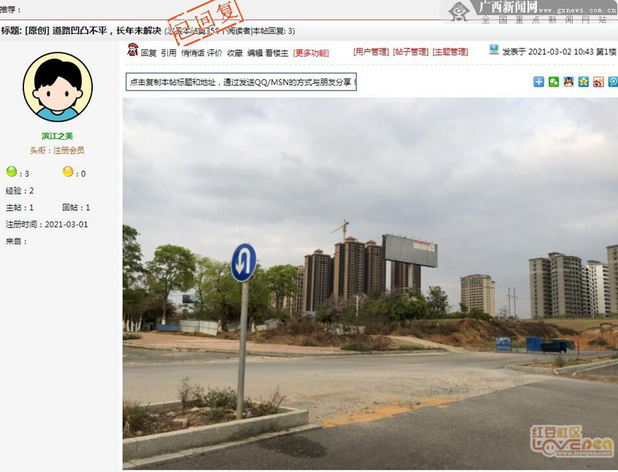 3月12日,来宾市城市管理局对《道路凹凸不平,长年未解决》帖文进行回复: