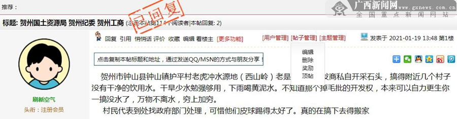 3月11日,贺州市钟山县自然资源局对《贺州国土资源局 贺州纪委 贺州工商 请处理水源地问题》帖文进行回复: