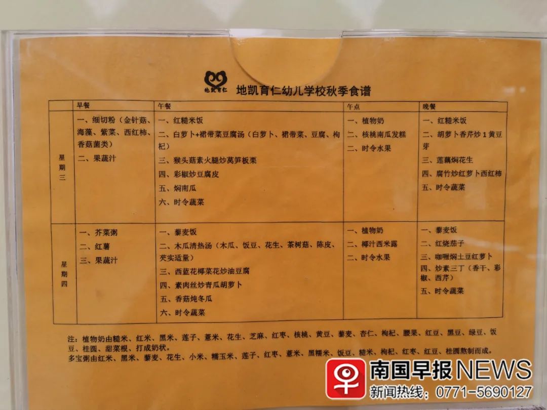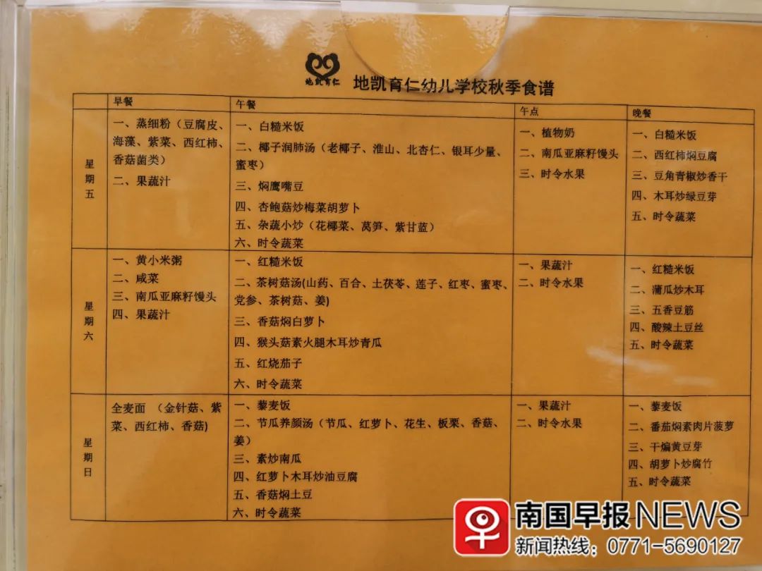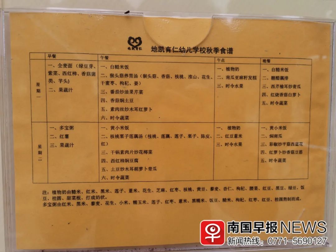 他们给幼儿提供的食谱,由徐博士的营养师团队为幼儿园专门设计,并张贴在幼儿园门口,家长在送孩子入园前,已经了解并接受幼儿园的素食理念。