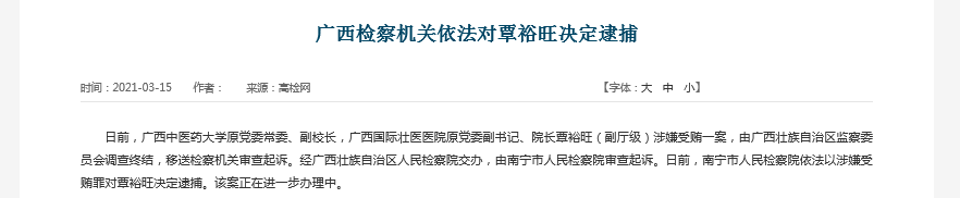 日前,广西中医药大学原党委常委、副校长,广西国际壮医医院原党委副书记、院长覃裕旺(副厅级)涉嫌受贿一案,由广西壮族自治区监察委员会调查终结,移送检察机关审查起诉。