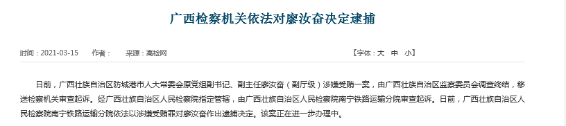 广西检察机关依法对廖汝奋决定逮捕