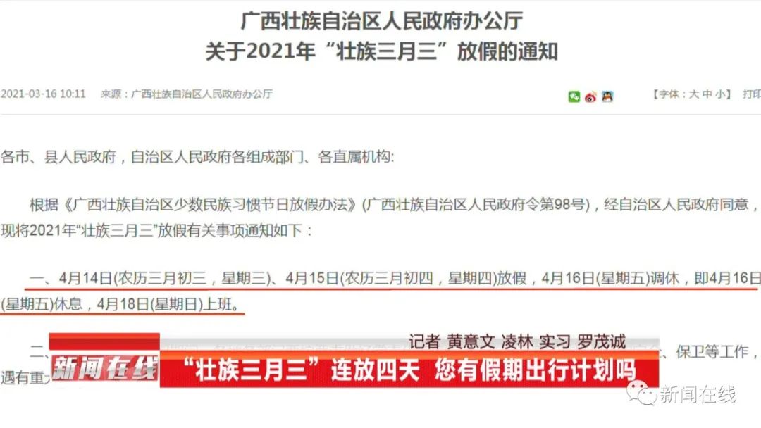 今年“壮族三月三”,广西的放假时间是4月14日至17日,其中,4月16日星期五是调休,即4月16日星期五休息,4月18日星期日上班。“世界那么大,只有广西在放假。” 连放四天假的通知一出,又到了一年一度的广西人“凡尔赛”时刻。不少人表示,得趁这个假期好好出门玩一趟。