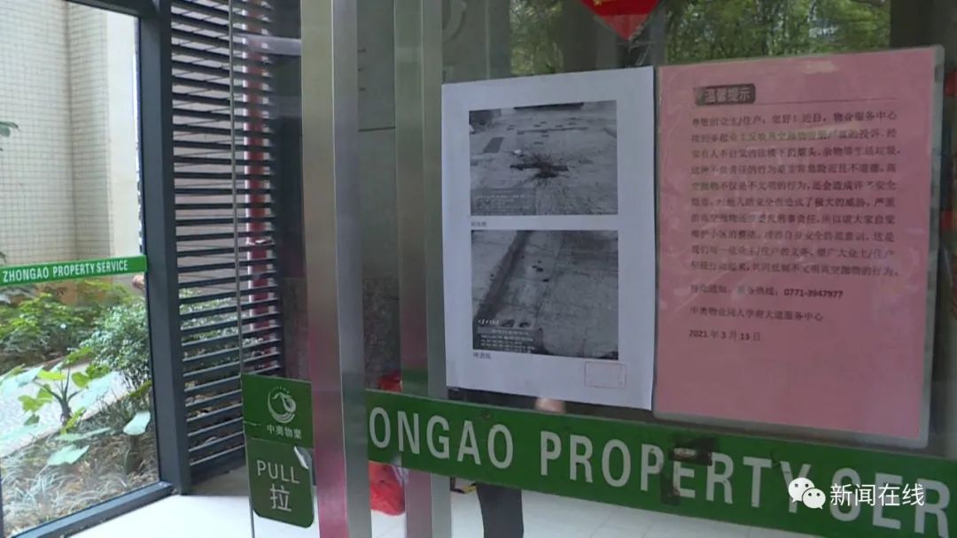 广西一小区连续一周天降玻璃瓶 砸在单元门通道上