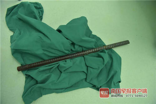 ▲刺入付先生体内的钢筋。苏坚摄