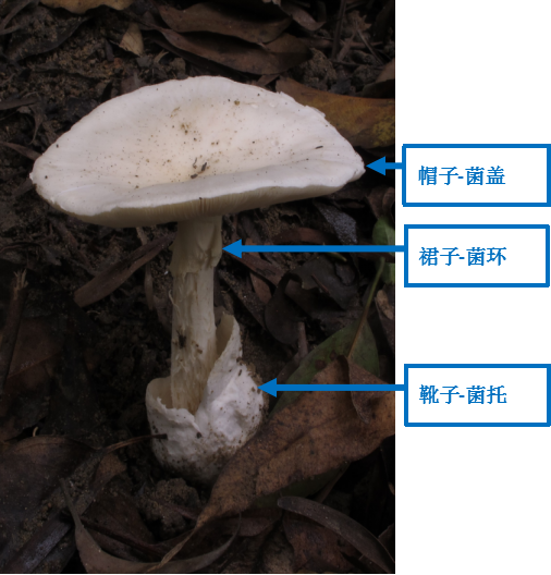 致命鹅膏生长在阔叶树林地上,周身雪白,偶尔菌盖表面中央部位为浅黄褐色。最大的特征就是“头上带帽(菌盖),腰间系裙(菌环),脚上穿靴(菌托)”。