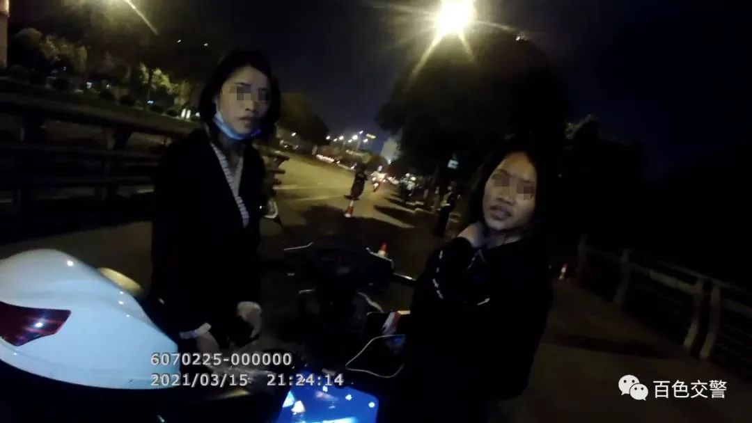3月15日晚21时许,广西百色市公安交警直属二大队在百色竹州桥路段设置临时执勤点开展夜查行动,民警依法对一辆桂L67***两轮摩托车进行检查。