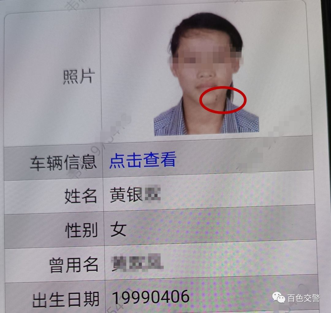 为了弄清真相,民警询问了后座女子的身份信息,系统显示该女子的名字为黄银X,系统中的照片的面部是有痣的,与驾驶员更为接近。