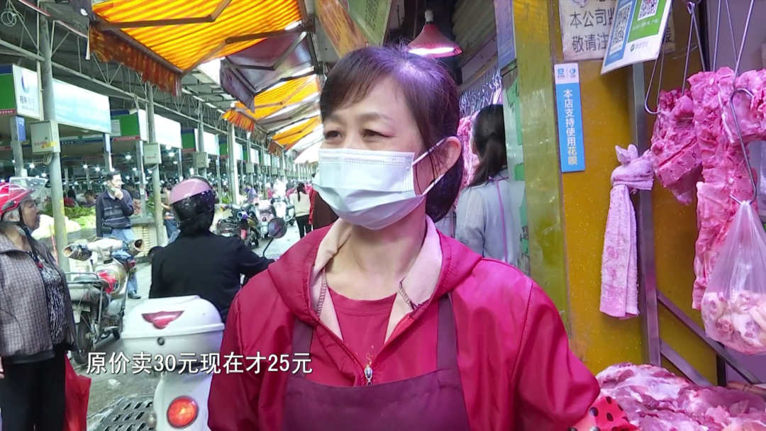 经营户谢女士表示,猪肉价格真的降了,以前精瘦肉原价卖30元现在才25元,过年前排骨卖40多元现在才30多元,以前过年前卖45元的,现在才36元。