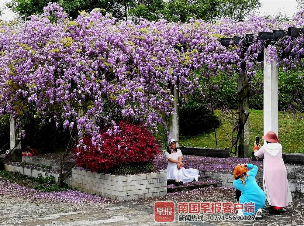 近期,在桂林市多个公园和居民小区里,如紫色瀑布般的紫藤花盛开,引来众多市民和游客拍照打卡。