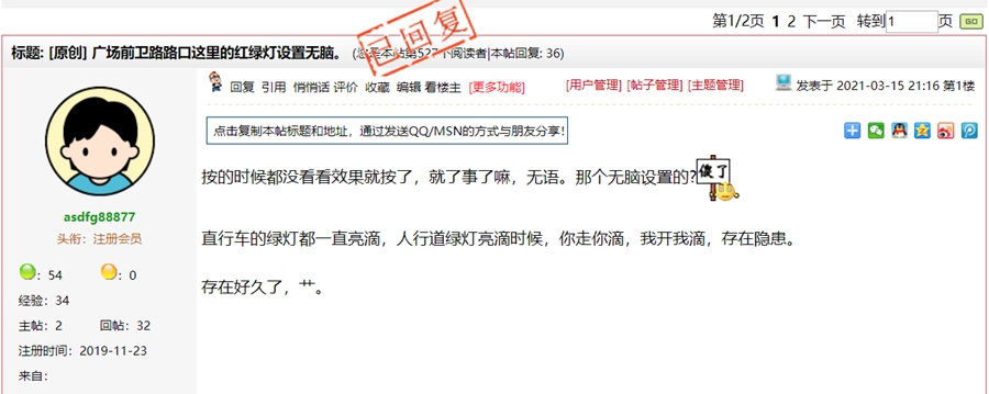 3月17日,来宾市交警支队对《广场前卫路路口这里的红绿灯设置无脑》帖文进行回复: