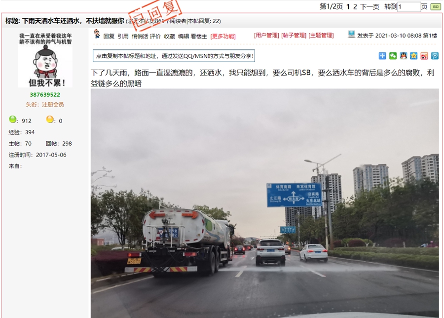 3月18日,来宾市城市管理局对《下雨天洒水车还洒水,不扶墙就服你》帖文进行回复: