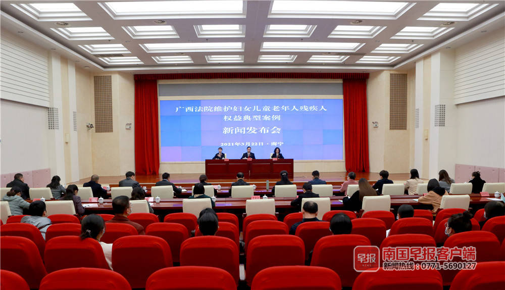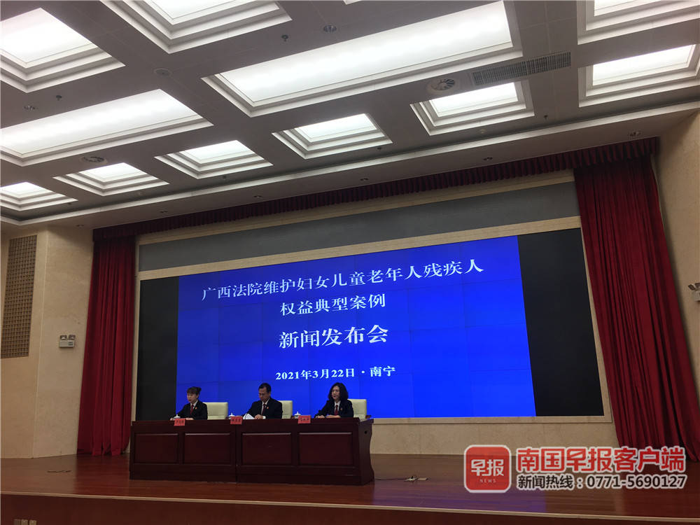 3月22日,自治区高级人民法院召开维护妇女儿童老年人残疾人权益典型案例新闻发布会,通报了广西法院维护妇女儿童老年人残疾人权益的情况,并发布了一批典型案例。