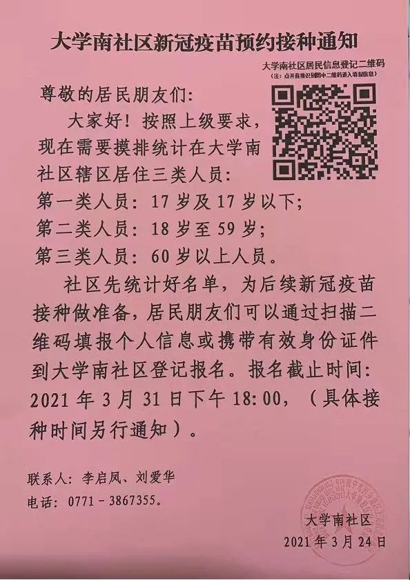 好消息!好消息!!可以自行约了!!!新冠疫苗预约二维码。广西区内已全面开放,识别二维码进行网上预约接种,填写个人信息,接种年龄18-59岁。接种免费!免费!免费!!