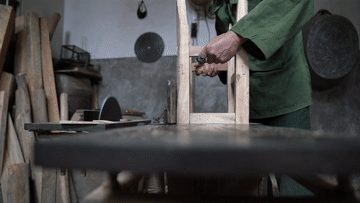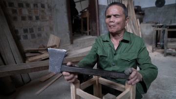 卢祥宁用斧头木柄衡量木凳腿长度是否合适