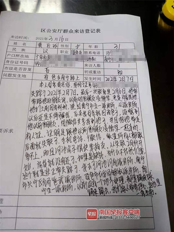 黄兆容的亲属说,他们了解到,近期凌某曾搬过家,在南宁换了住所。黄石玲说,家人四处奔波寻找,报警、信访、求助,但屡屡碰壁,如今已是心力交瘁、走投无路。