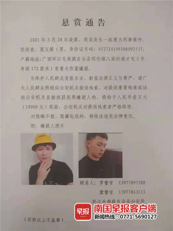 28日下午6时许,南国早报客户端记者从当地有关部门了解到,嫌疑人莫某提已经被警方抓获。据了解,莫某提1992年出生,环江明伦镇八面村坡才屯人。