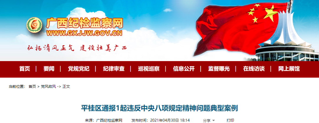 贺州市平桂区通报1起违反中央八项规定精神问题典型案例