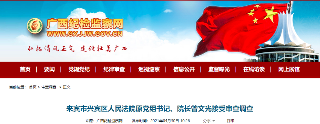 据来宾市纪委监委消息:来宾市兴宾区人民法院原党组书记、院长曾文光涉嫌严重违纪违法,目前正接受来宾市纪委监委纪律审查和监察调查。