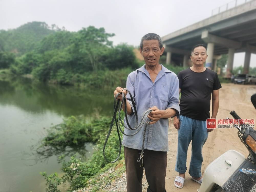 ▲黄明全(左)和黄传栋(右)用胶带救人。博白县委宣传部供图