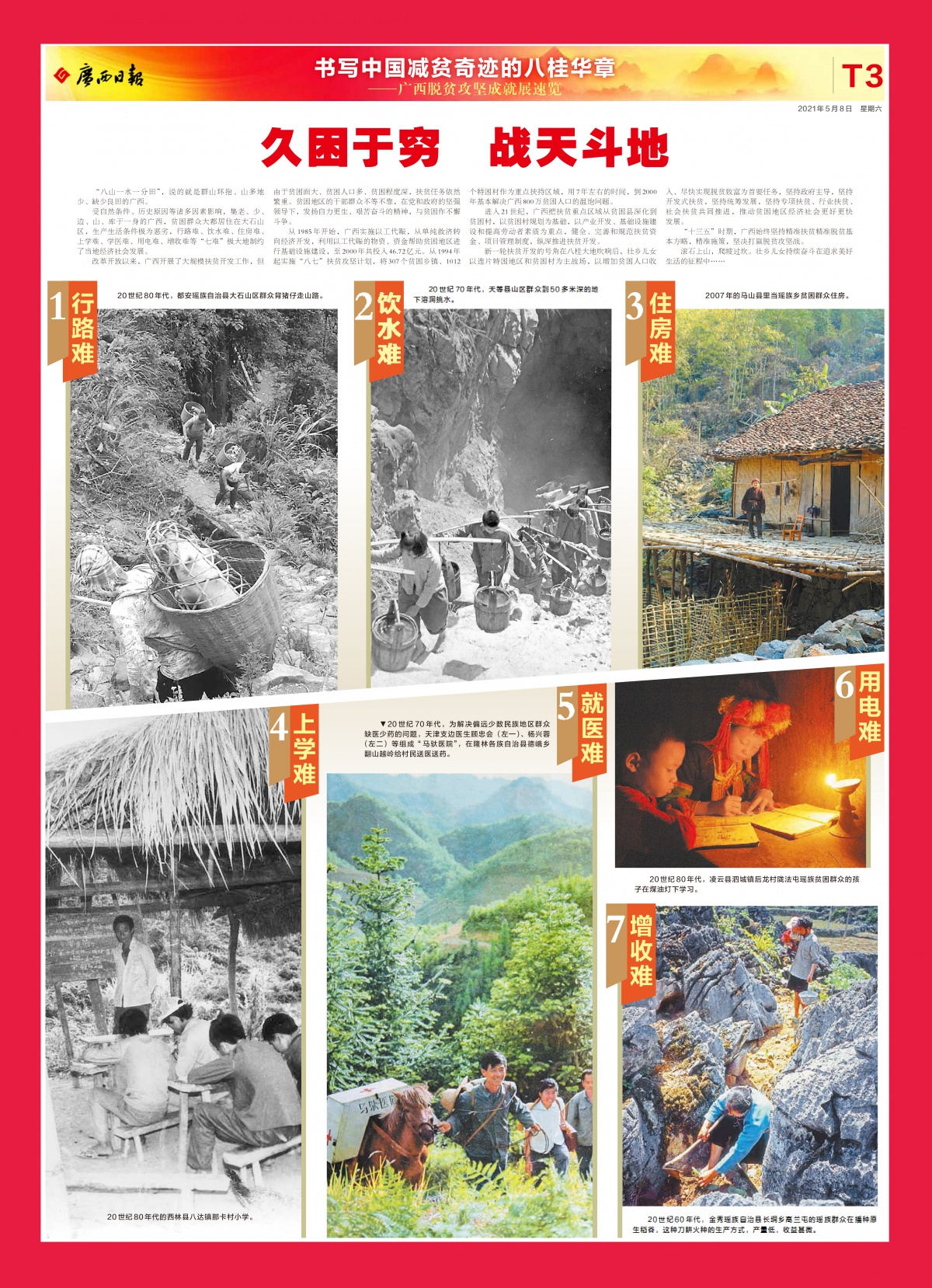 “八山一水一分田”,说的就是群山环抱、山多地少、缺少良田的广西。特刊3版介绍成就展“久困于穷 战天斗地”篇章,行路难、饮水难、住房难、上学难、就医难、用电难、增收难等“七难”,曾极大制约广西各地经济社会发展。