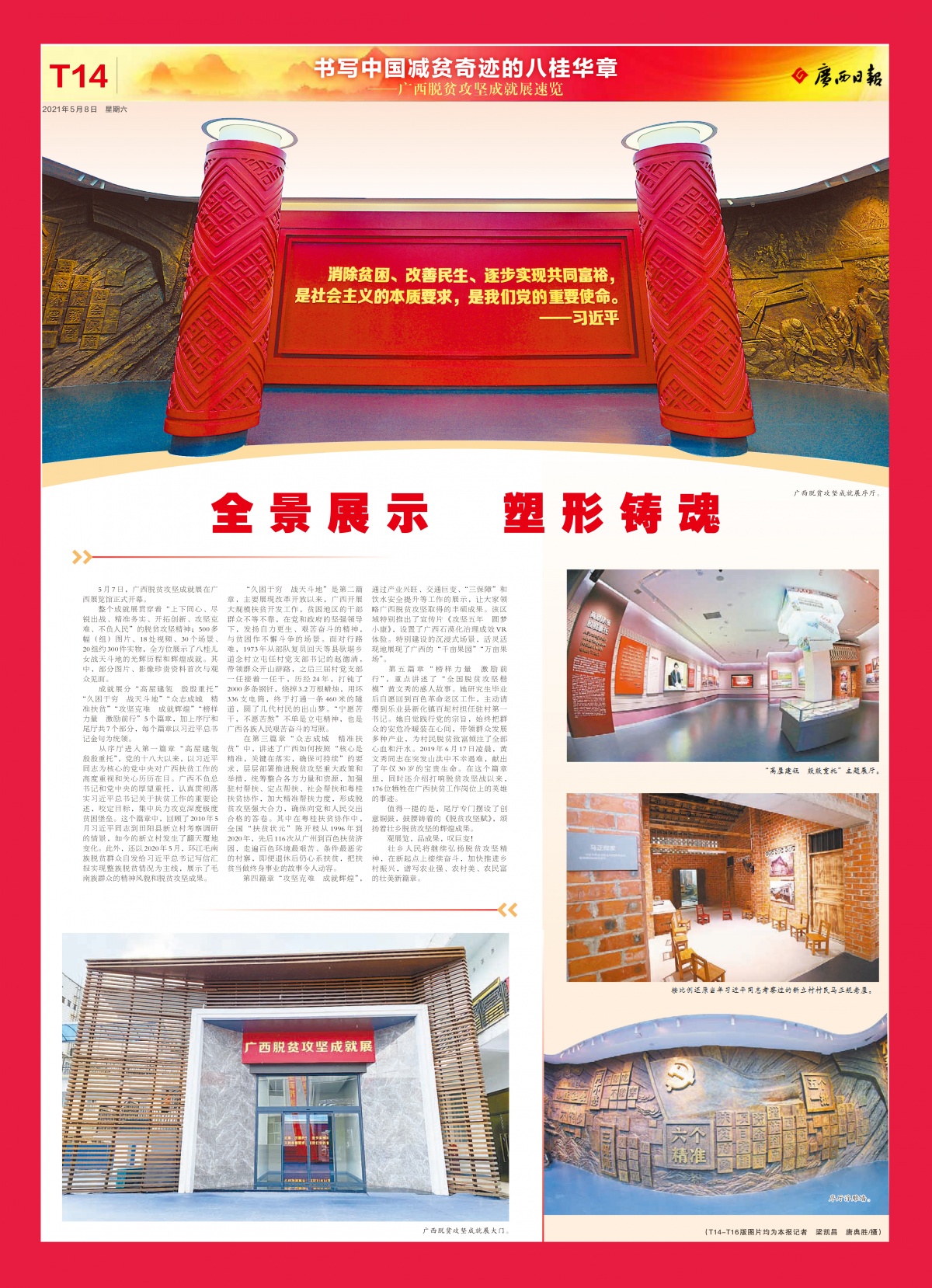 5月7日,广西脱贫攻坚成就展在广西展览馆正式开幕。整个成就展贯穿着“上下同心、尽锐出战、精准务实、开拓创新、攻坚克难、不负人民”的脱贫攻坚精神;500多幅(组)图片、18处视频、30个场景、20组约300件实物,全方位展示了八桂儿女战天斗地的光辉历程和辉煌成就。其中,部分图片、影像珍贵资料首次与观众见面。特刊14-16版对广西脱贫攻坚成就展的整体情况进行了详细介绍。