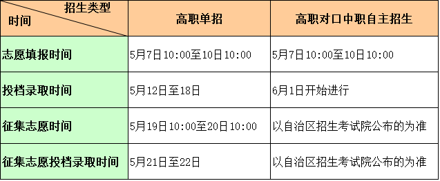 高职对口中职自主招生投档录取时间由原定的5月12日至18日调整为6月1日开始进行,录取结果查询及征集志愿填报时间顺延,具体时间请以自治区招生考试院公布的为准,请考生密切关注相关信息。
