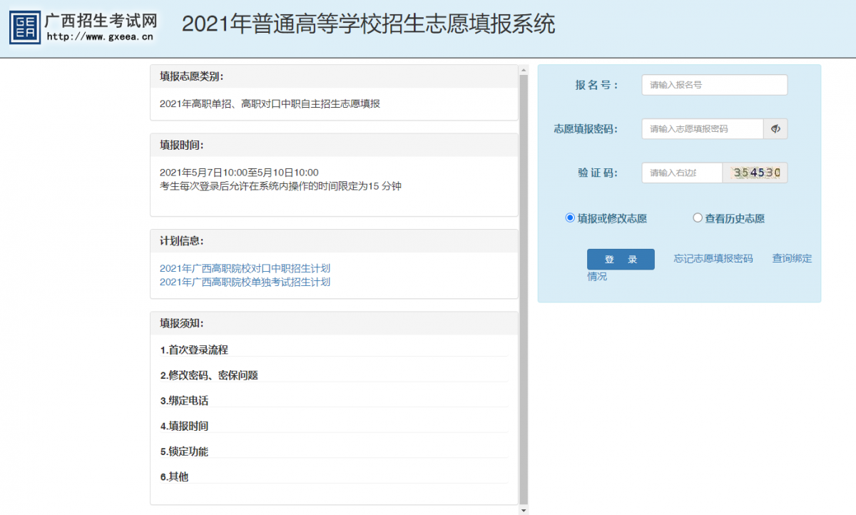 已参加招生院校组织的高职单招或高职对口中职自主招生测试并取得相应测试成绩的考生,登录“广西招生考试院”网站“系统导航-志愿填报-2021年普通高校招生志愿填报系统(高职单招/高职对口中职自主招生志愿填报)”填报志愿。