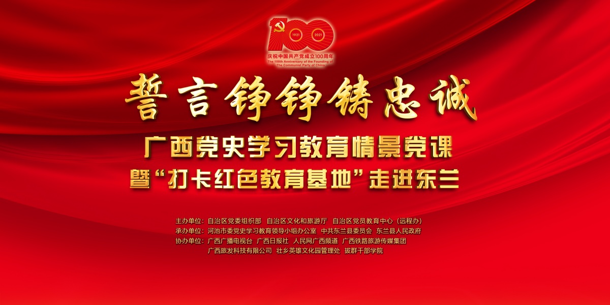 广西新闻网南宁5月9日讯 学党史,铸忠诚。为深入推进党史学习教育和对党忠诚教育,由自治区党委组织部、自治区文化和旅游厅、自治区党员教育中心(远程办)主办,河池市委党史学习教育领导小组办公室、东兰县委县政府承办,广西广播电视台综艺旅游频道、 广西日报-广西云、广西旅发科技公司等单位共同打造的“誓言铮铮铸忠诚”党史学习教育情景党课,将于5月10日上午9:30在广西农民运动讲习所旧址——列宁岩(河池市东兰县)誓言广场开讲,并通过云直播的方式面向全区党员展播。