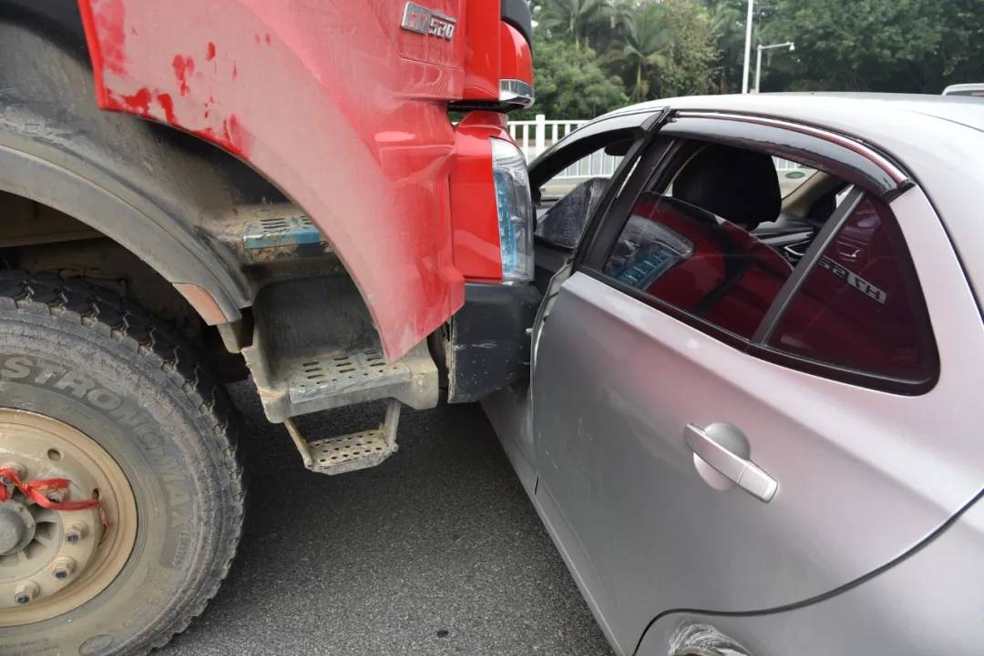 据大货车驾驶人梁某自述,事发前由于自己行驶在左侧车道,感觉会妨碍其他车辆行驶,便向右转进入右侧主车道行驶,变道的过程中感觉撞到了其他物体。“开始我还以为是自己车辆发生故障,于是我左右观察后视镜,并没有发现什么,直到旁边有人向我示意车头有东西,我观察前下视镜后才发现一辆小轿车横在车头。”