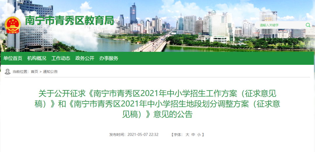 近日,南宁市青秀区教育局发布公开征求《南宁市青秀区2021年中小学招生工作方案(征求意见稿)》和《南宁市青秀区2021年中小学招生地段划分调整方案(征求意见稿)》意见的公告。该公告征求时间为30天,6月5日截止。