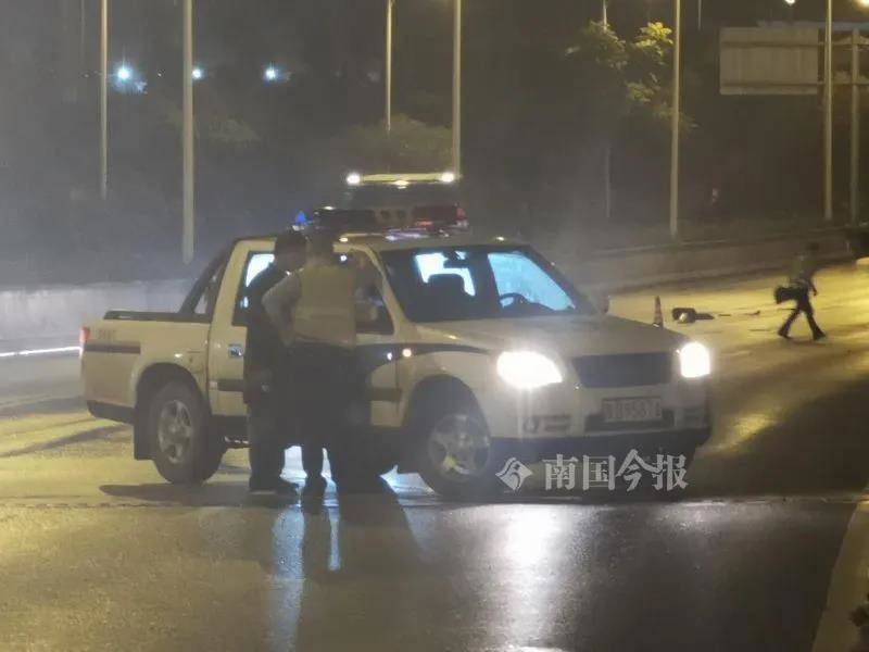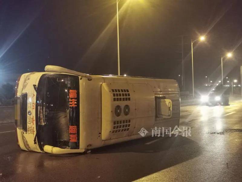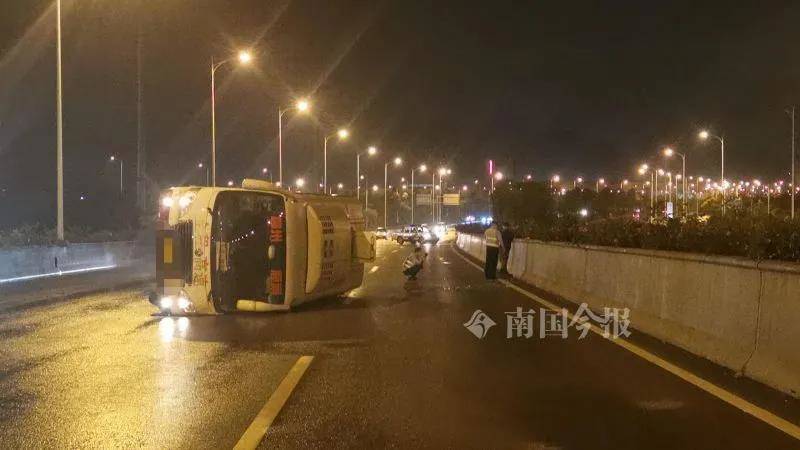 当晚8时许,记者赶到博园大道立交桥上,看到事故中巴车侧翻在机动车道上,驾驶室玻璃有碎裂。交警正在现场调查。