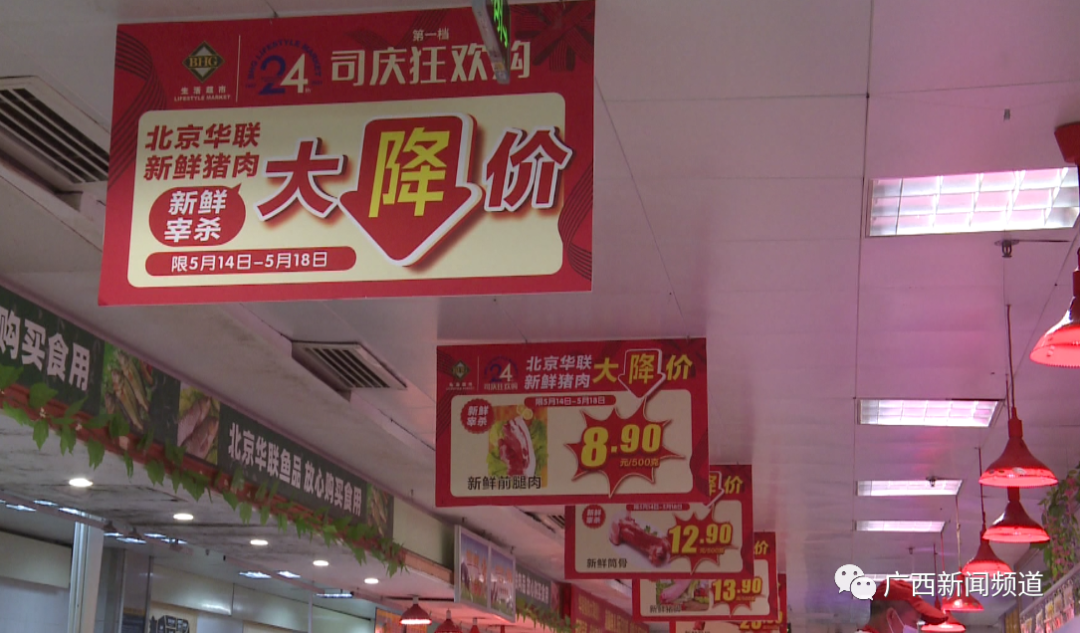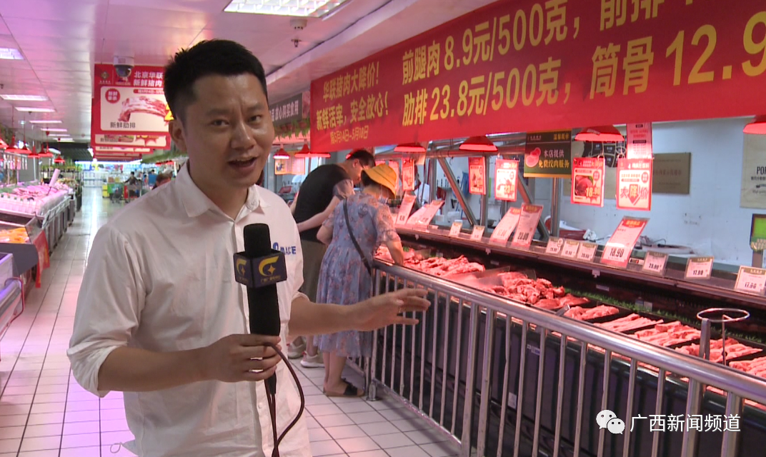 记者 覃尚荣:这里是北京华联广西地区民族宫店,在全国的猪肉价格在持续下调的时候,大家可能都会想,我能去到哪里买到最便宜的猪肉。那么在这里我们找到了答案,那么在这几天,我们可以说在广西最便宜的猪肉就是在这里,像比如这个普通的前腿肉在这里卖到了8.9元/斤。