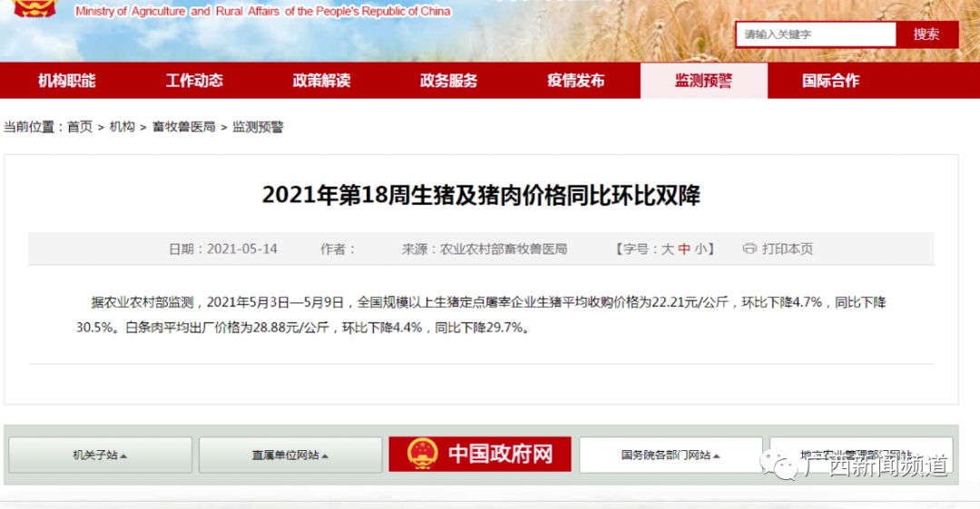 记者今天还走访了南宁市青秀区的一些农贸市场,发现多家市场的猪肉价格基本一致。南宁淡村农贸市场管理人员的记录显示,今年2月10日淡村市场边猪进货价是52元/公斤,5月15日,边猪进货价为24元/公斤,这几天最低的记录是20元/公斤。3个多月,南宁市的边猪价格下跌幅度超六成。据农业农村部监测,2021年5月3日—5月9日,白条肉平均出厂价格为28.88元/公斤,环比下降4.4%,同比下降29.7%。2021年5月7日-14日,全国猪肉的价格平均为28.86元/公斤,环比下降5.2%,同比下降33.2%,猪肉价格在今年已经连续下降15周。